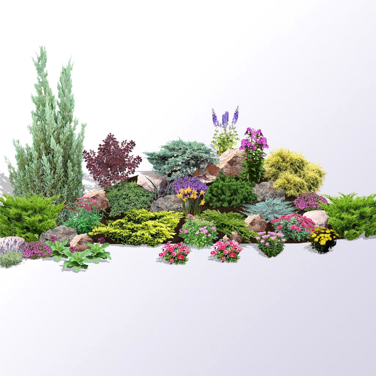 На самом верху красуется дельфиниум тихоокеанский. Справа низкорослый флокс метельчатый. Разбавляем почвопокровными ранне весенними цветами. У нас флокс шиловидный фиолетового и розового цвета. Две альпийские гвоздички, пару астр новобельгийских, бадан, шалфей и луковичные обеспечат цветение вашей клумбе с ранней весны до поздней осени!