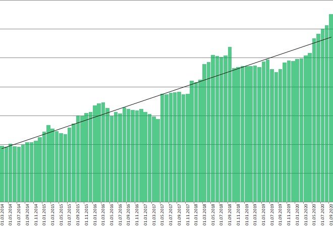 На картинке - график изменения капитала одного из первых и самых верных моих клиентов; ежемесячно начиная с марта 2014 года