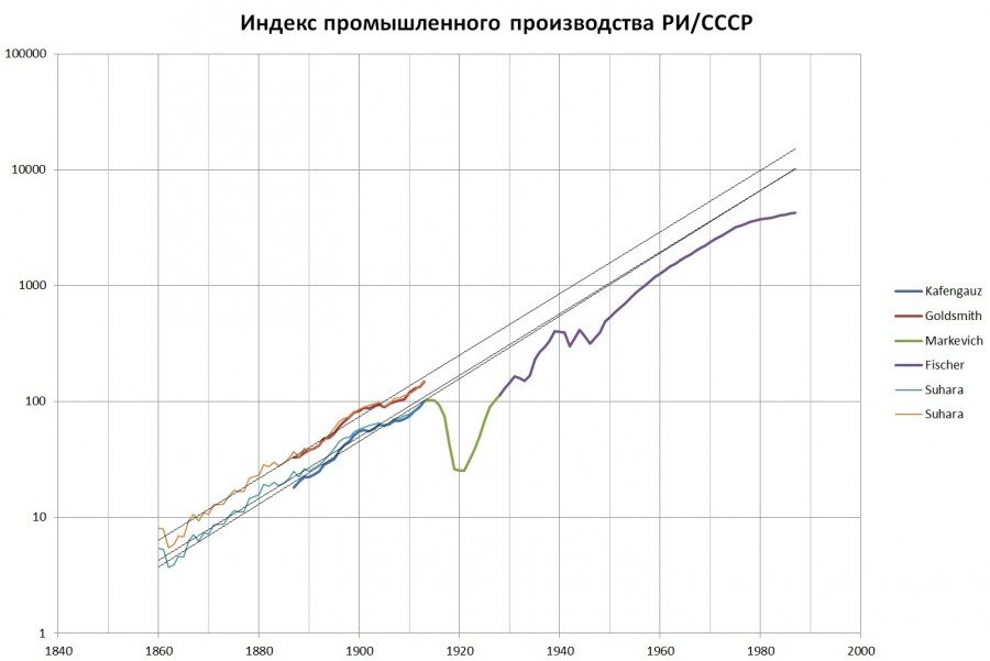 На графике под именами Голдсмит и Кафенгауз идут расширенные варианты их индексов. В частности Кафенгауз отнормирован на точку 1913=100, так же как и индекс Маркевича Харрисона. А индекс Голдсмита примерно отнормирован на общий объем промышленности РИ, если принять промышленность РИ-1913 в границах СССР-1928 за 100. Индекс Сухары отнормирован соответсвенно на значения Голдсмита и Кафенгазуза за 1913. Для Сухары и Кафенгауза показаны тренды тонкими черными линиями. Вот примерно такая получается разница, если не принимать в рассмотрение советский период.