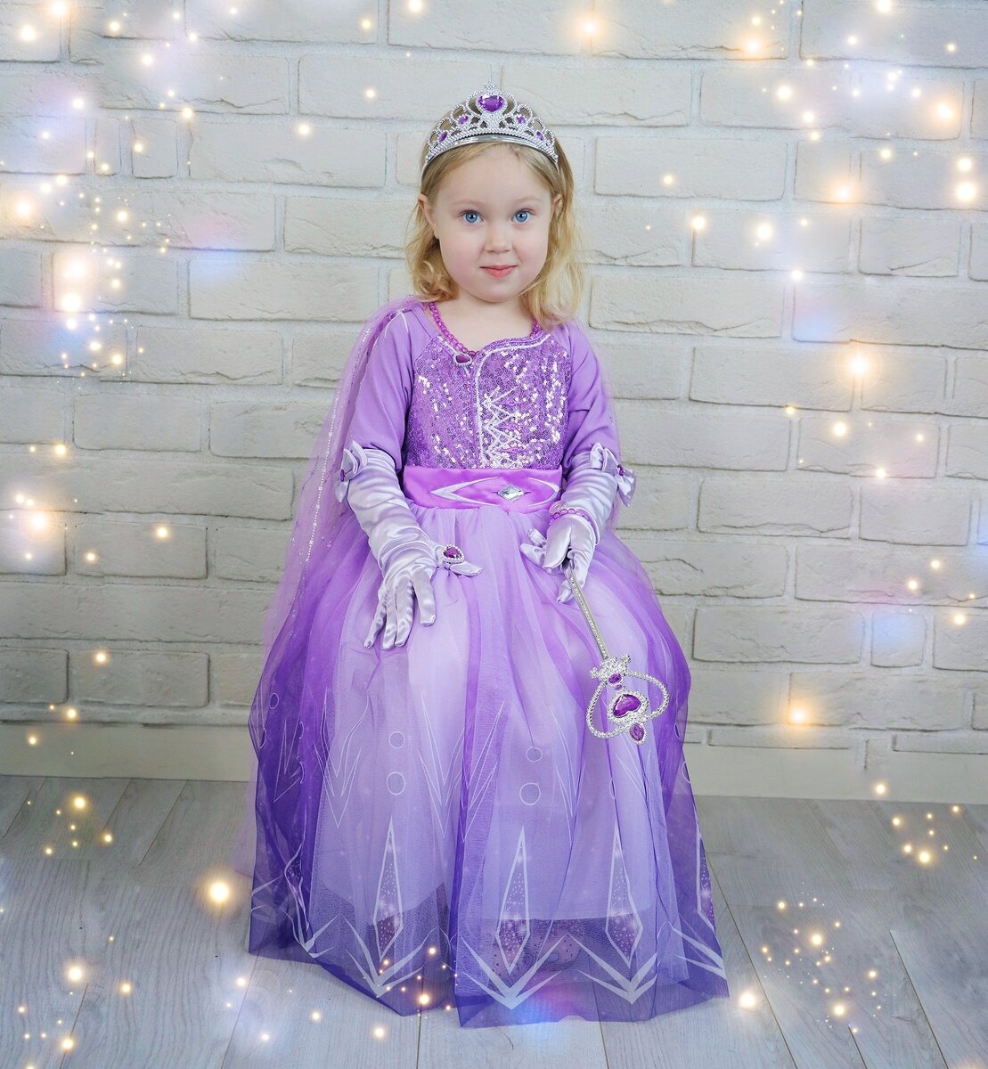 Костюм яркий наряд включает в себя пышное платье со шлейфом (сьемный) и множество пластиковых аксессуаров. В таком костюме юнная особа точно будет чувствовать себя принцессой.
