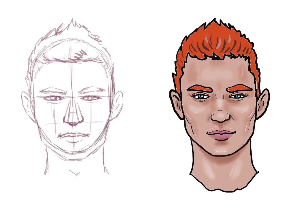 Шаг7: Теперь создаем новый слой и толстой линией обводим все наши линии. Старый слой удаляем, или если вы рисуете на листе, стираем все тонкие линии. Добавляем цвет, чуть теней и некоторые выразительные акценты, чтобы придать нашему лицу глубину😁.