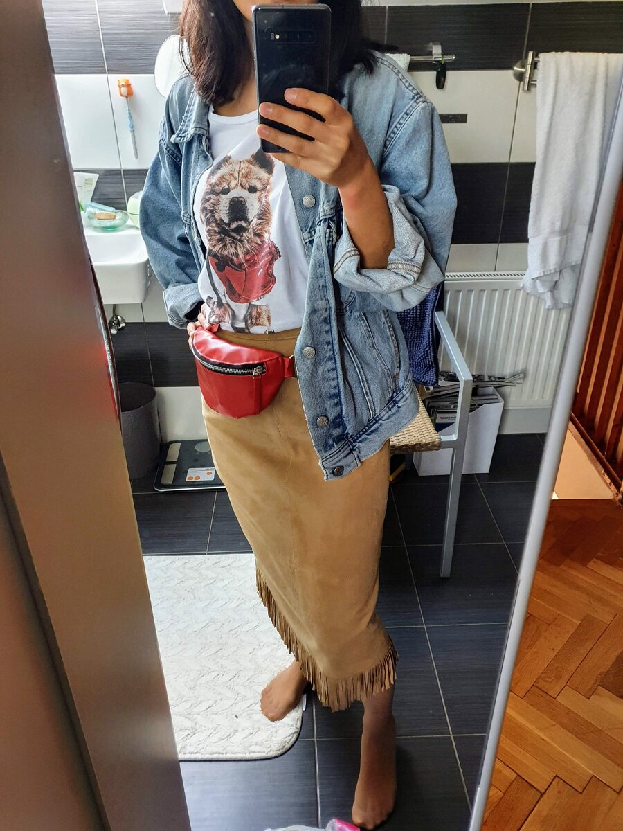 Я купила футболку (она уже мелькала в нескольких постах), была, кстати, новая. И эту юбку из натуральной замши очень хорошего качества. Я долго думала, стоит ли ее брать, в итоге купила и надела всего два раза и, скорее всего, больше не надену. То есть я промахнулась с выбором. Теперь эта юбка висит в моем шкафу и просто меня бесит.