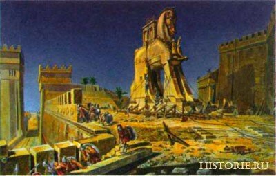 Наконец, Одиссей придумал хитрость. Древние Греки построили огромного деревянного коня, в брюхе которого спрятались воины. Коня оставили у стен города, а сами демонстративно отплыли на кораблях домой. Троянцы поверили, что враг ушёл, и затащили коня в город, радуясь такому необычному трофею. Ночью воины, прятавшиеся внутри коня, выбрались наружу, открыли городские ворота и впустили в Трою своих товарищей, которые, как оказалось, незаметно вернулись к стенам города. Троя пала. Ахейцы уничтожили почти всех мужчин, а женщин и детей увели в рабство.