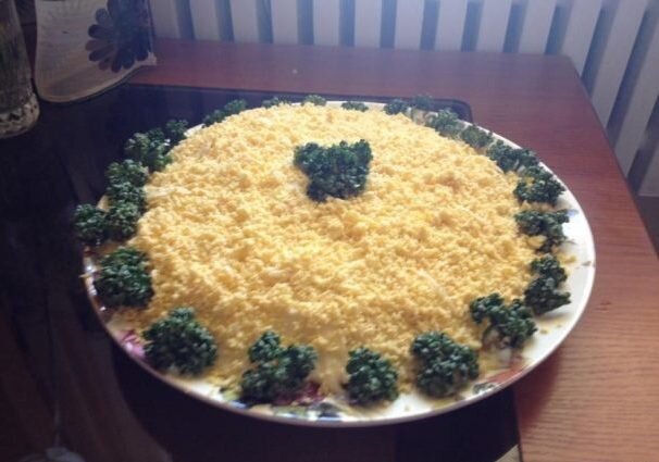 Описание приготовления: Рецепт салат мимоза, главными ингредиентами в котором служат консервы из рыбы, куриные яйца лук и заправка из майонеза. Название блюда полностью отражает его вид - салат изображает в себе цветы мимозы на