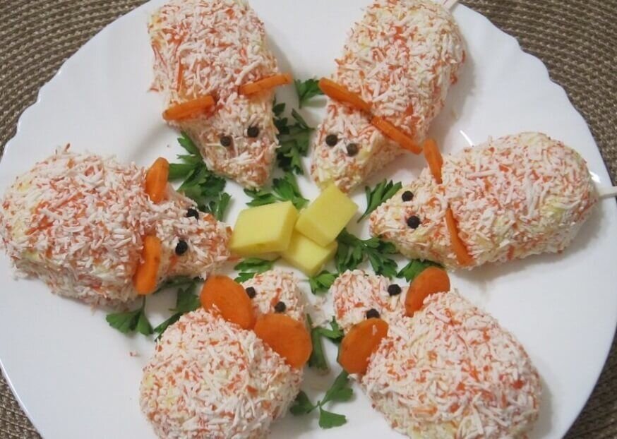 Приготовление: 1.Сыр натереть на терке. Чеснок пропустить через чеснокодавку. 2.Смешать сыр и чеснок, заправить майонезом. Убрать в холодильник на 20 минут. 3.Крабовые палочки натереть на терке. 4.Из сырной массы сформовать овальные формочки. Обвалять их в тертых крабовых палочках. 5.Из морковки сделать ушки, перец горошком послужит глазками мышек, из крабовой палочки нарезать тонкие полоски - это будут хвостики мышей.