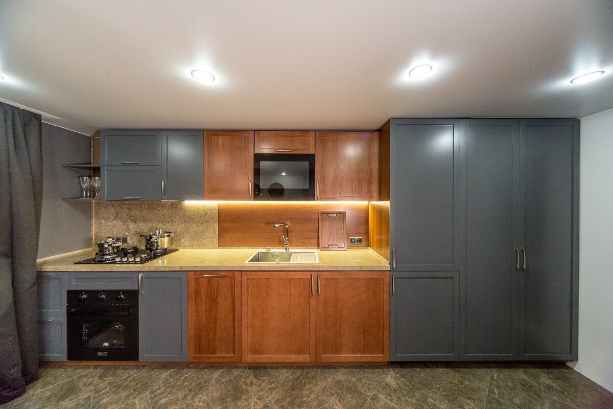 Кухонный массив с корпусами из ЛДСП разбит на несколько частей разной отделкой и не выглядит тяжеловесным. Секции скрывают вместительную систему хранения с выдвижными ящиками и открытыми и закрытыми полками, а также встроенную технику, включая газовое оборудование.
