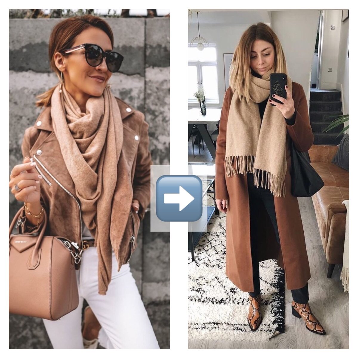 Шарф можно и нужно носить как с пуховиком и пальто, так и с косухой, пиджаком и курткой рубашкой. По возможности, выбирайте шарф из шерсти, так будет теплее. Для того, чтобы образ с шарфом выглядел гармонично, пользуемся правилом: если в образе есть хотя бы