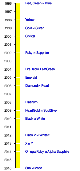 По хронологии выхода серию игр делят на поколения. Каждое поколение начинается с выхода пары игр основной серии на портативную игровую систему. Как правило, эти две игры почти ничем не отличаются друг от друга, кроме покемонов для ловли. На данный момент существует семь поколений. С каждым поколением увеличивается количество существующих видов покемонов, и появляются нововведения в игровой процесс. Игры основной серии сделаны в жанре японской ролевой игры, а многочисленные игры-ответвления бывают самых разных жанров[13].