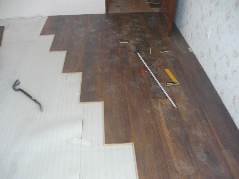 Перед тем, как приступить к укладке, необходимо установить степень неровности. Если она составляет более двух миллиметров, основное покрытие нужно отшлифовать. Далее проводится укладка гидроизоляции, которая выполнена из полиэтиленовой или полипропиленовой пленки. После, укладывается звукоизоляция. В качестве звукоизоляции под ламинат, используют гофрированный картон или пробковое дерево. Далее следует укладка ламината.