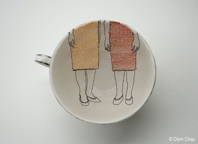 На изящной фарфоровой чашечке вышиты силуэты людей, которые словно застыли в своей привычной повседневности. Кажется, малейшее дуновение ветерка, и, фигурки оживут, вернувшись к рутинным занятиям. Невозможно поверить в реалистичность творений художницы, решение использовать посуду в качестве пяльцев кажется абсурдным.