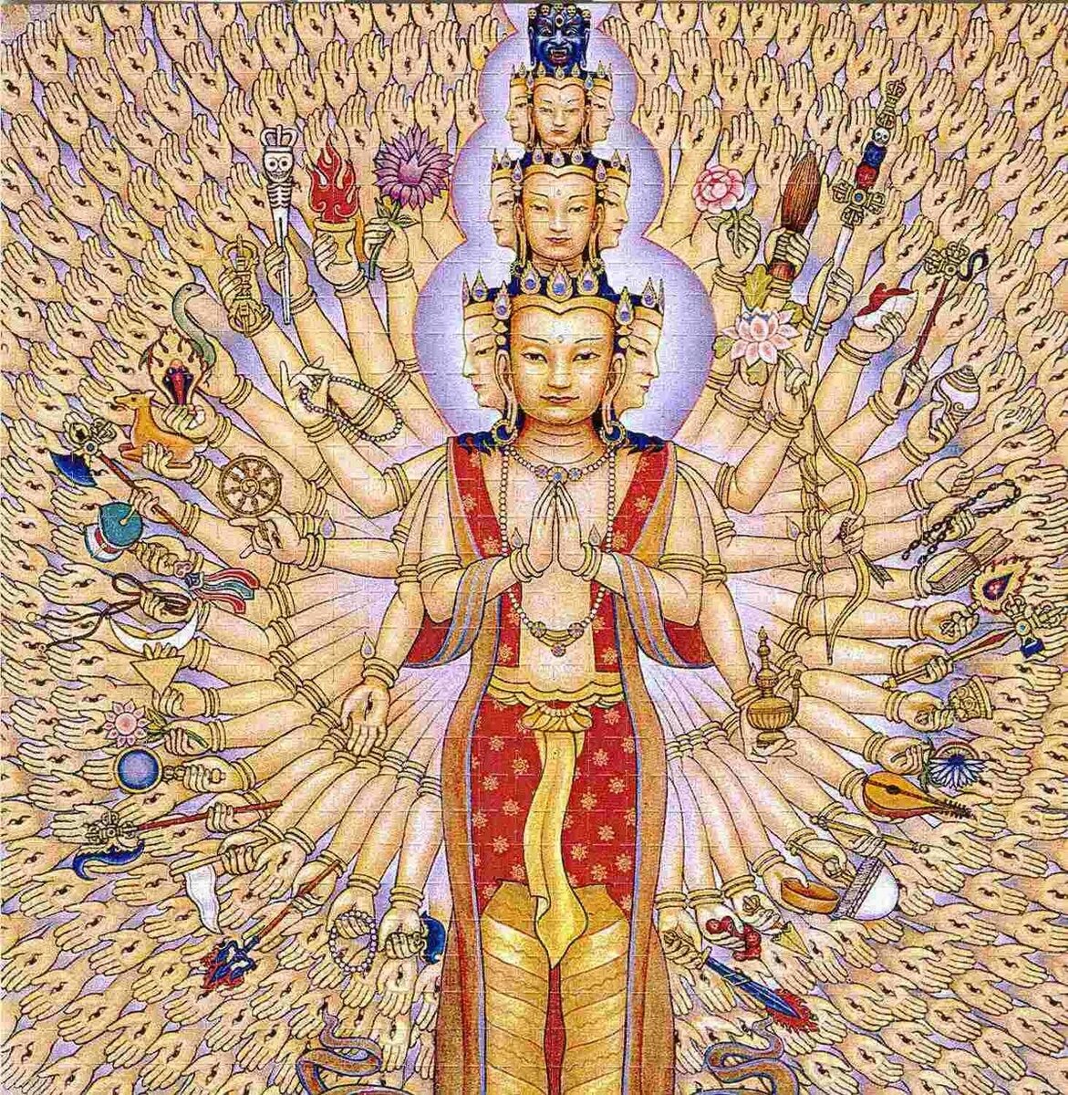 Притча о Гуань Инь ( Авалокитешвара) — богиня милосердия, которую иногда изображают с тысячью рук, в каждой из которых она держит по какому-нибудь инструменту. Если она решит, например, применить копье, то не будет пользы ни от одной другой руки (999). И только потому, что ей никогда в голову не приходит идея пользоваться только одной рукой, она использует то одну руку, то другую, поэтому все ее руки оказываются ей полезными. Таким образом, данная фигура должна показать, что если осознать истину, то даже такая вещь, как тысяча рук на теле, может быть очень полезна.