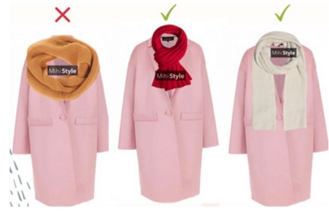 Следите за соответствием фактур. Воздушные шарфики не смотрятся с нарядами из грубой ткани в стиле кэжуал, шерстяной шарф будет диссонировать с легким тренчем.