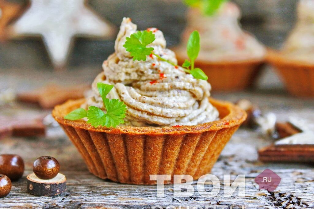 6 - Добавить к грибам творожный сыр, снова взбить, переложить крем в кондитерский шприц и заполнить тарталетки. Готовые тарталетки припорошить молотой паприкой, украсить свежей зеленью и до подачи держать в холодильнике.