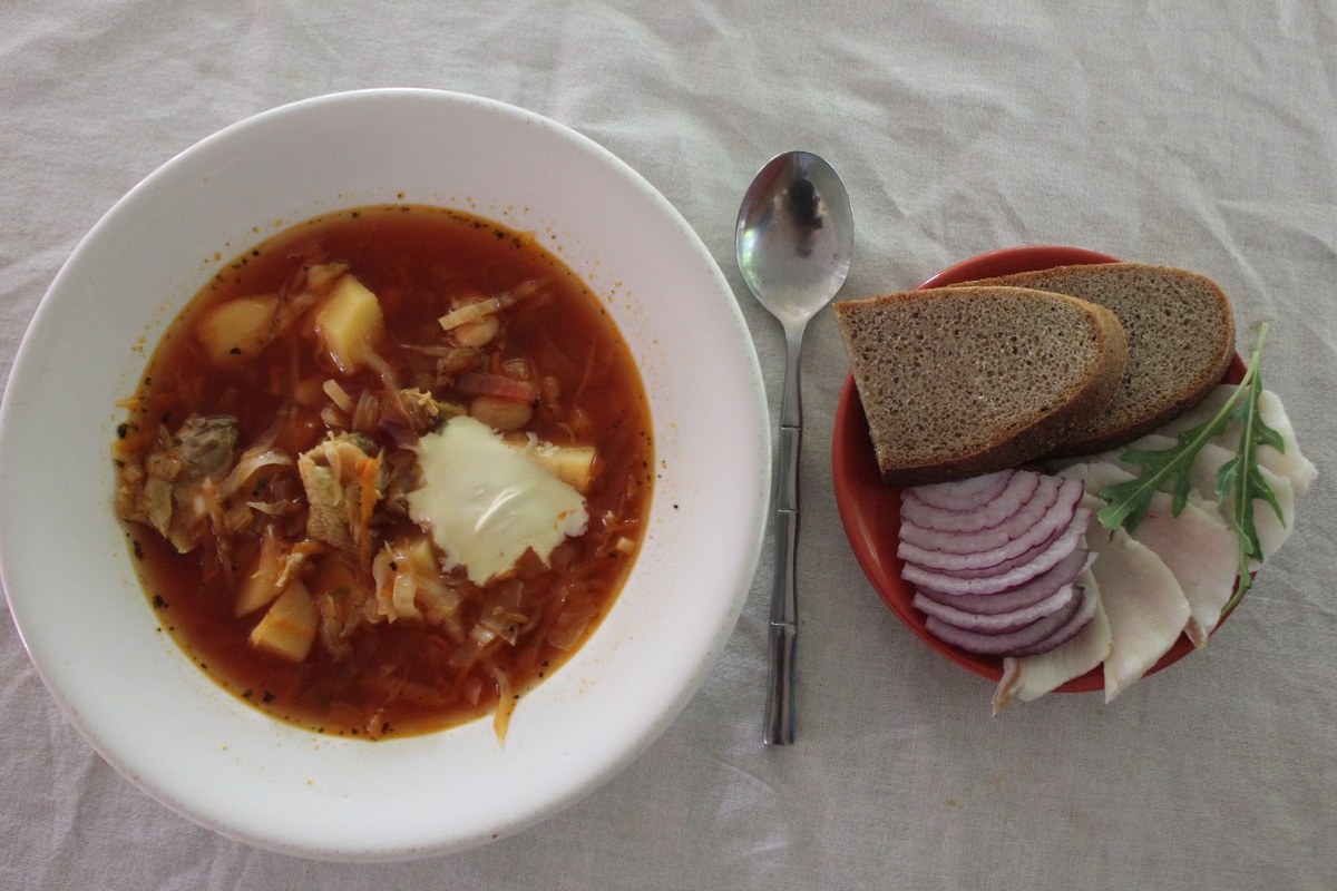 Предлагаю приготовить борщ за 30 минут по классическому украинскому рецепту. У меня есть свой секрет, который делает блюдо уникальным. Съедаем быстро и что интересно, чем дольше стоит, тем вкуснее. А с луком и салом просто пальчики оближешь. Что понадобится Готовлю на мясном бульоне. Использую курочку. Мясо не жирное, время приготовления 20 минут. Ингредиенты Продукты расчитаны на пяти - литровую кастрюлю: Подготовка овощей Наливаю в кастрюлю воды 3 л, кладу мясо и варю 20 минут. Пока мясо варится нарезаю овощи. Свеклу - тонкими полосками. Картофель - кубиками. Морковь натираю на терке. Лук, капусту - шинкую полосками. Приготовление борщевой заправки Пока мясо варится готовлю заправку. Поджариваю лук и морковь на подсолнечном масле. Добавляю томатную пасту, бульон, зелень, приправы и провариваю 1-2 минуты. Чеснок измельчаю в чесночнице. Удобно использовать сушенный чеснок. В каком порядке добавлять ингредиенты Через 20 минут, когда мясо сварилось бросаю свеклу. Варю пять минут и к