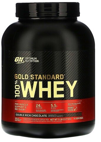 - Optimum Nutrition 100% Whey Gold Standard. Продукция компании Optimum Nutrition является по совместительству и ее визитной карточкой. Он назван так не зря: благодаря характеристикам этот концентрат считается «золотым стандартом» для всех концентрированных белковых смесей. Секрет легкого усвоения кроется в сбалансированном составе, в который входят сывороточные изоляты, концентрат, пептиды молочной сыворотки, глютамин, а также ферменты аминоген и лактаза, которые улучшают усвоение белка. Продукт отлично растворяется, имеет богатую палитру вкусов и хорошо действует на мышечную массу. Пользователи отмечают только один существенный недостаток: цену на уровне некоторых изолятов.