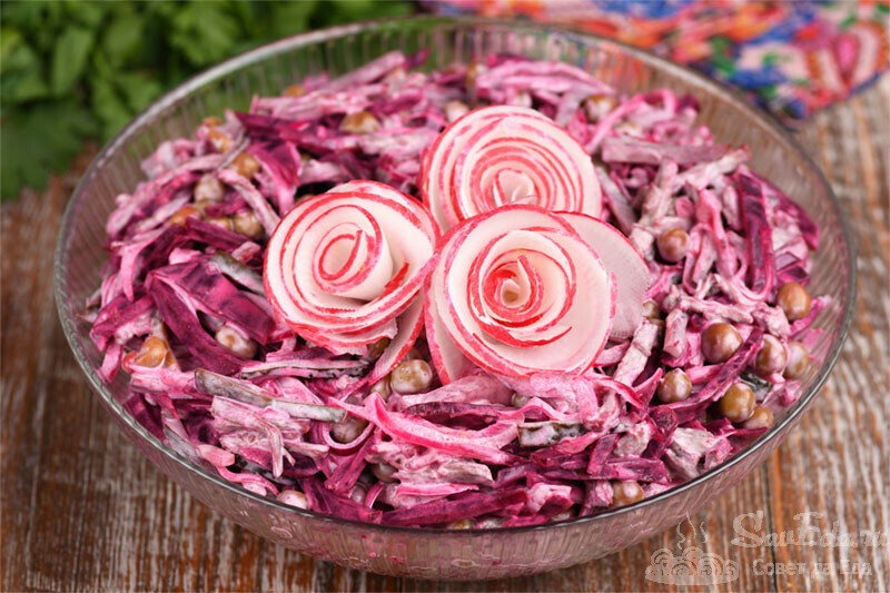 9. Салат с говядиной и свеклой перекладываем в салатник (у меня 2 шт.), украшаем и подаем на стол. При помощи овощечистки у красной редьки срезала тонкие пластины, свернула их и закрепила зубочистками (концы отрезала ножницами). Салат получается яркий, сытный и очень вкусный.