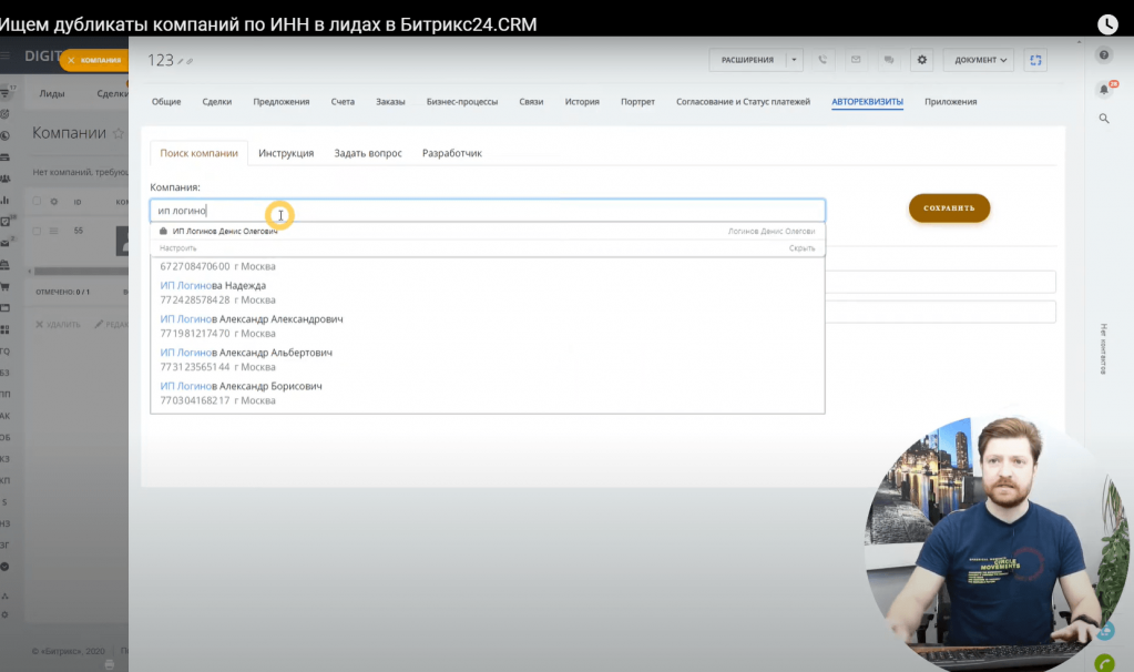 Реальность: Компания работает очень активно, Для генерации лидов используется много форм обратной связи на сайтах или импорт из внешних источников, Ключевое идентификационное поле каждой компании является ИНН. Главный вопрос дня обратилась новая компания в первые или она уже зарегистрирована в базе данных?