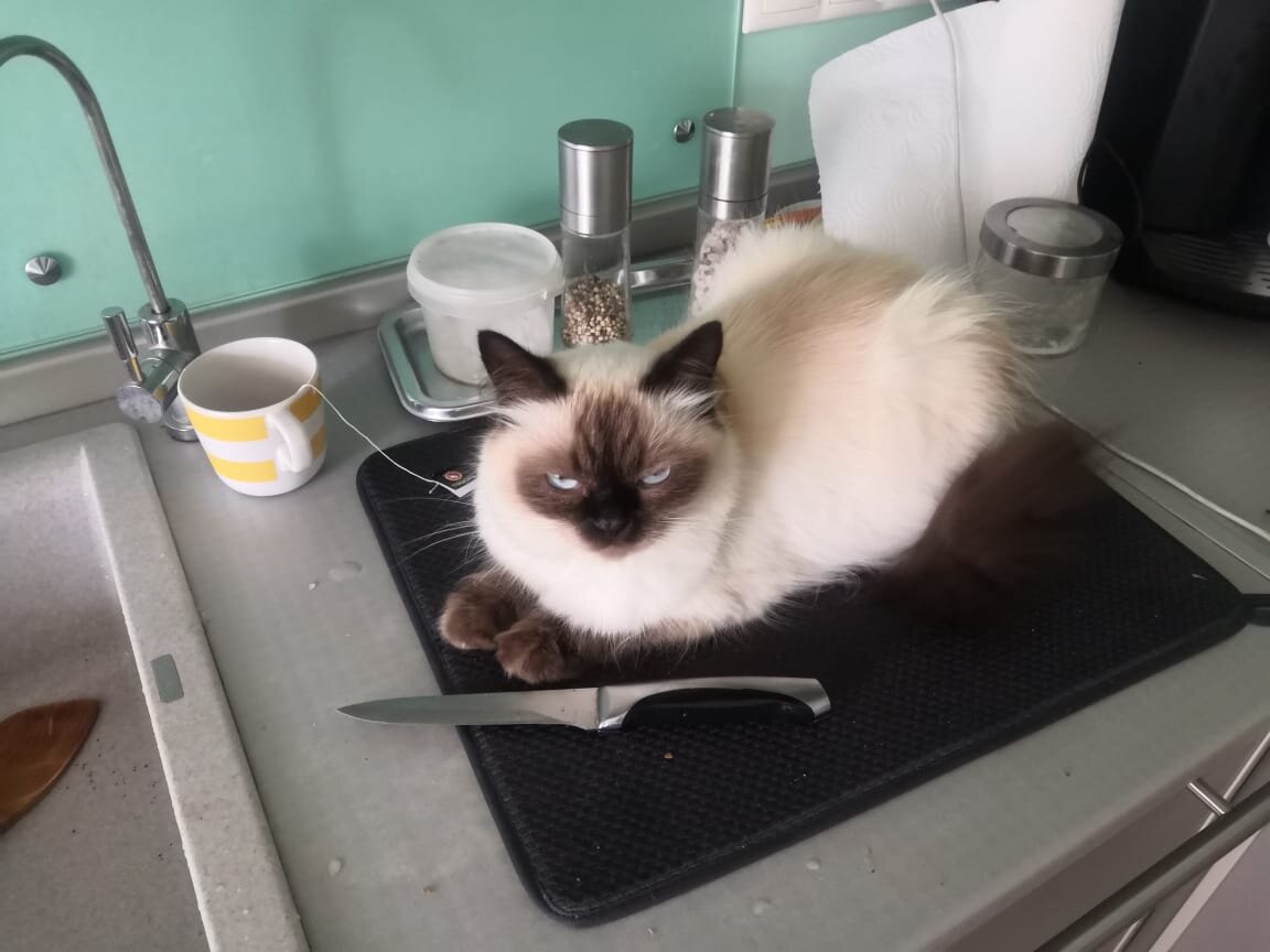 Она любит ходить по столам и наблюдать за мной, что я делаю.