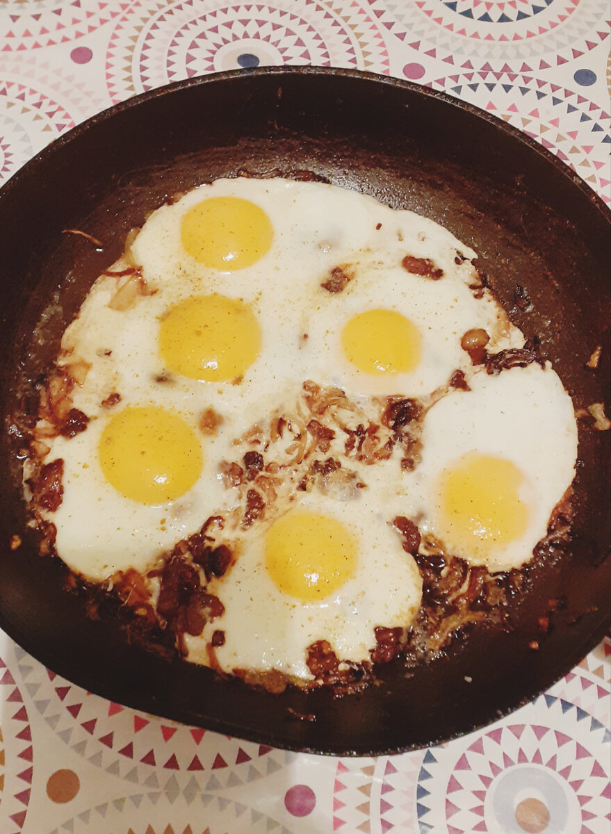 3. Когда лук будет почти готов, разбиваем яйца, солим. Убавляем огонь и готовим до готовности.