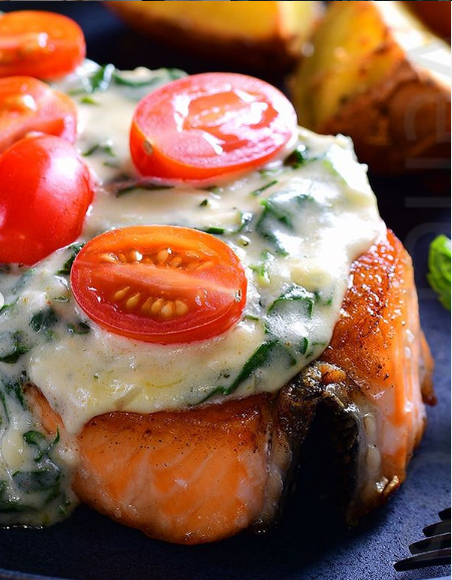 Стейки из красной рыбы со сливочным соусом и шпинатом