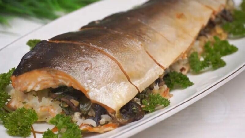 Вкуснятину выложите на удлинённое сервировочное блюдо, нарежьте на кусочки и украсьте зеленью с краёв. Вот такое супер сочное и ароматное угощение у нас получилось. Горбуша сама по себе рыба вкусная и сладкая, но фаршированная она превосходит самые безупречные праздничные блюда. Не верите, тогда вам стоит обязательно попробовать и убедиться в этом лично!