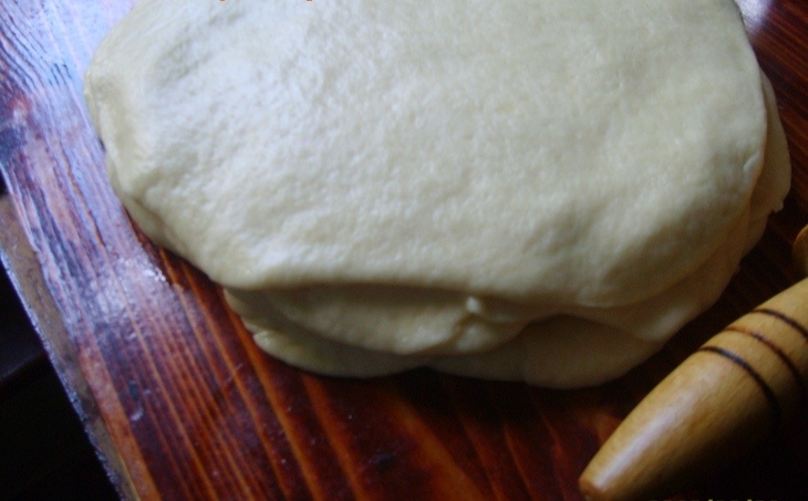 Накрываем смазанную лепешку второй и получившуюся стопочку отодвигаем в сторону. Раскатываем еще одну лепешку, смазываем маслом верхнюю из стопочки и опять накрываем лепешкой. Так проделываем со всеми оставшимися 5 лепешками. Получаем примерно такую конструкцию: 8 лепешек, прослоенных растопленным маслом.