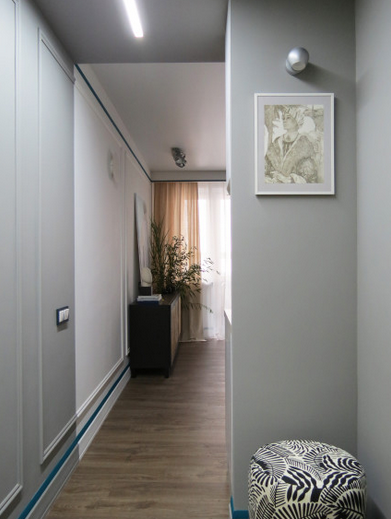 Планировку изменили по минимуму: небольшой перегородкой из гипрока отделили прихожую от кухни-гостиной, при этом немного удлинили столешницу.