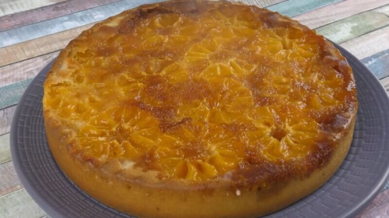 Вот такая аппетитная шарлотка с красивым узором сверху в итоге получилась. Тесто пропиталось мандариновым соком и стало мягким, сочным, нежным с ароматным запахом. Сам же фрукт ни сколько не испортил свой вид и вкус. Если мандарины–это запах Нового года, то такой десерт вполне символичный!