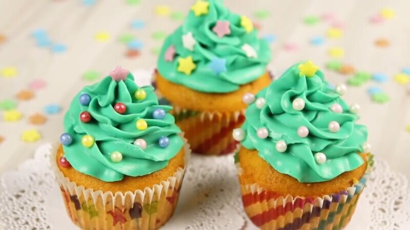 Этот рецепт для самых маленьких сладкоежек. Если в новогодний вечер взрослые заняты основными блюдами, то деткам такое может не понравиться. Им не нужны яства из курицы, шашлычок или оливье. А вот что-то по слаще, да по вкуснее–это детская тема. Думаю, что такие яркие ванильные капкейки с кремом выложенным в форме ёлочки маленьким непоседам точно понравятся.