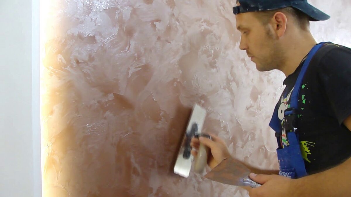 Нанесение шелковой штукатурки. Наносится смесь кельмой размер ее выбирается в зависимости от того рисунка, который вы хотите получить. После частичного подсыхания по поверхности проходят кельмой еще раз создавая нужную фактуру. Начинайте работу с угла. Не обрабатывайте сразу всю поверхность, работайте участками по 1,5 – 2 м2. Края обработанного участка должны быть не ровными, иначе впоследствии у вас будут видны стыки слоев. В труднодоступных местах используйте специальные небольшие инструменты. Если такие места есть озаботьтесь покупкой инструмента заранее. Видео. Как наносить шелковую штукатурку. Как сделать имитацию декоративного покрытия мокрый шелк Самым распространенным эффектом, который хотят получить, когда используется декоративная штукатурка является мокрый шелк. Пошагово разберемся как создать мокрый шелк своими руками. Технология нанесения как отмечалось ранее почти не будет отличаться от общей для всех смесей этого вида: Подготовка – не отличается от стандартной. Приготовление – не отличается (смесь почти всегда продается готовой). Базовое покрытие – используйте тот же состав что и для будущей отделки, наносите его кельмой, не создавая никакого рисунка. Мокрый шелк технология нанесения – Начинайте работу от угла. Работайте с небольшими участками. Наносите раствор с помощью обычной кельмы разнонаправленными движениями. Дождитесь пока нанесенный слой начнет подсыхать. Пластиковой кельмой (шайбой) с незначительным нажимом делаете движения, напоминающие цифру 8. От размера шайбы и ширины движений будет зависеть размер рисунка. Почаще мойте поверхность кельмы водой. Это поможет избежать прилипания ее к раствору. Эффект жатого шелка описание технологии Описываемая декоративная штукатурка позволяет создать на стене эффект жатого шелка. Как и для предыдущего эффекта весь процесс начиная с подготовки до создания покрытия будет аналогичным. Описывать его не имеет смысла лишь коротко напомним этапы.