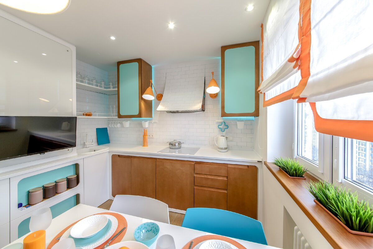 В этом проекте дизайнеру удалось совместить всегда актуальный белый цвет с уютными деревянными фасадами и подоконником и добавить яркие акценты в виде верхних навесных полок и различных цветных маленьких аксессуаров.
