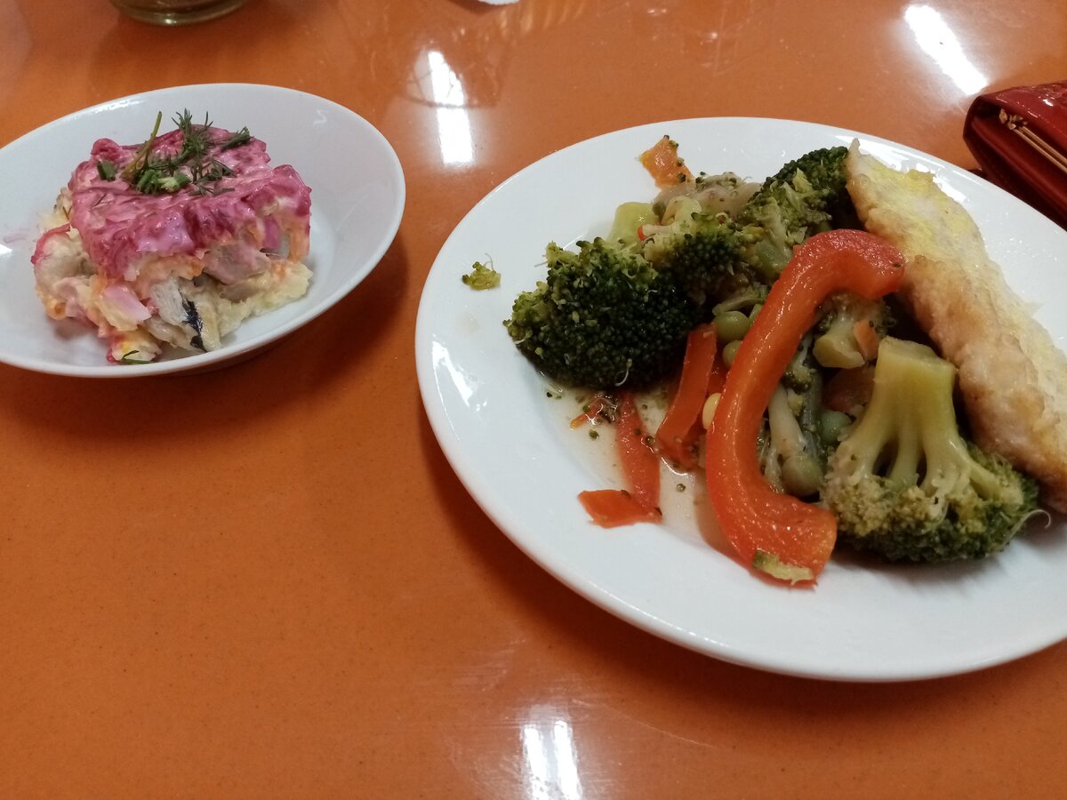 Покажу то, что заказала сегодня. Порция салата "Сельдь под шубой", овощи и отбивная из курицы. Цена обеда - 150 р.