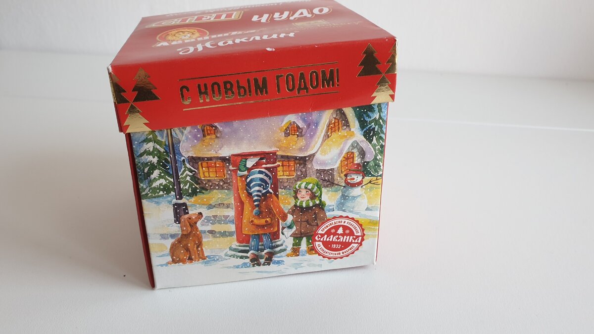 Сегодня будем ковыряться вот в такой красивой коробочке. Это небольшой стильный кубик от кондитерской фабрики Славянка. На обложке коробки ностальгические картинки с открыток.