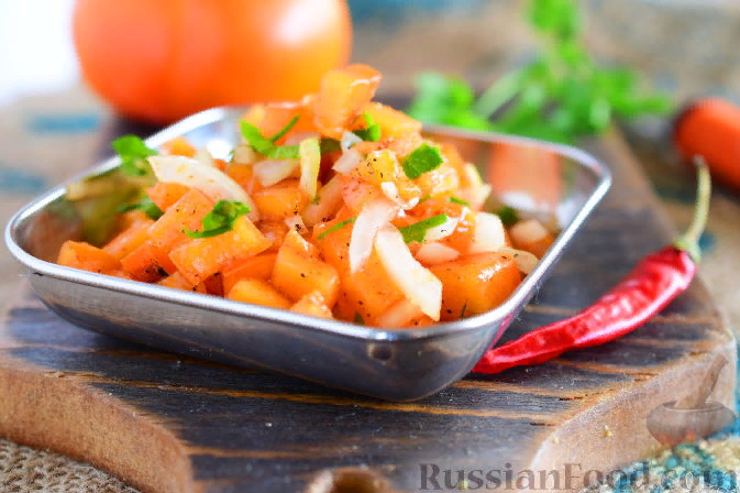 Сальса из хурмы может быть подана к столу как самостоятельный овощной салат или как соус к мясному или рыбному блюду.