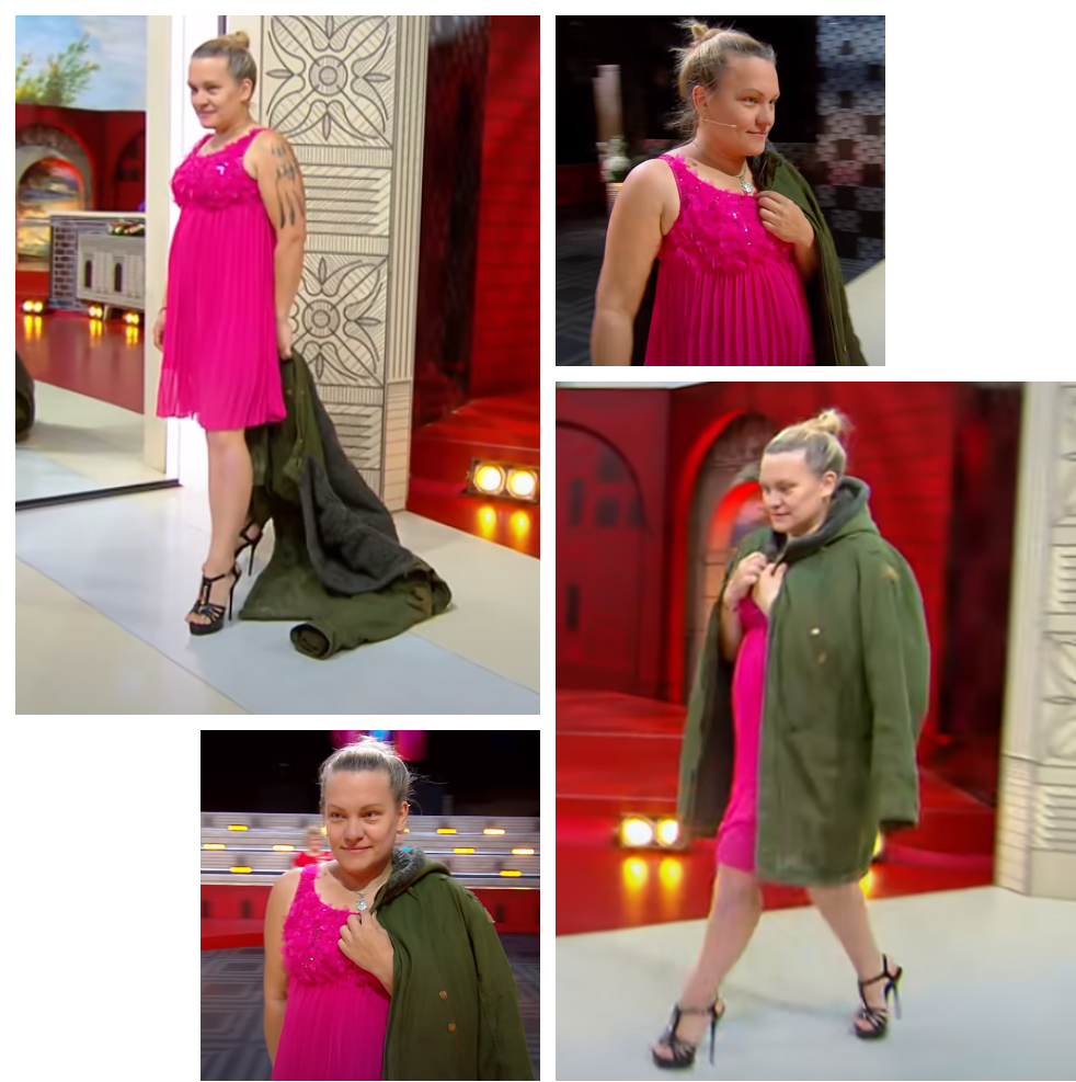 Размер вещей не для параметров Ганны. Она теряется в тряпках и на глаза скрывается от нас.