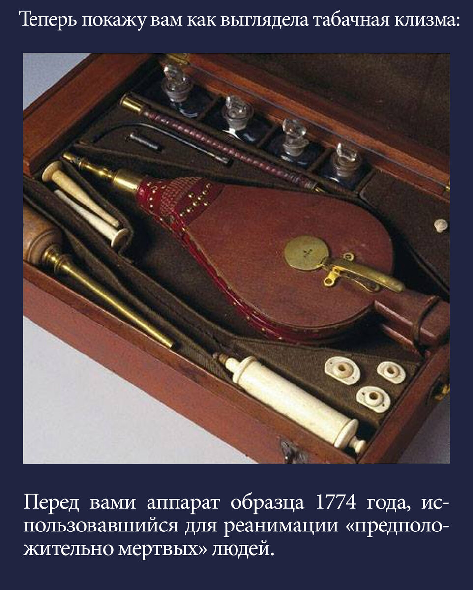 В Нидерландах спасать, например, утопленников решили иным способом. Вполне логичным казалось, что если курение табака усиливает частоту сердцебиений и глубину дыхания, то почему бы утопленника не накурить? А… он же не дышит. Ладно, зайдем с другого конца. Буквально. Сделаем ему клизму с табачным дымом! Заодно и прогреем его… изнутри.