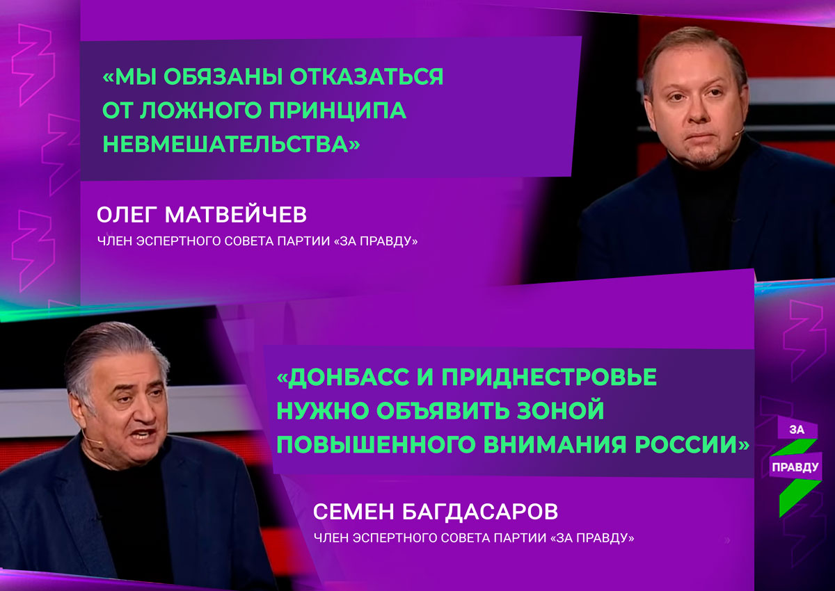 России необходим союзный договор, с признанием Донбасса, Приднестровья и других регионов. А до того, как это произойдет юридически и организационно, нужно объявить эти территории зоной повышенного внимания со стороны Российской Федерации. Любое нападение, которое будет совершено той или иной стороной, будет расценено, как нападение на Российскую Федерацию, и Россия будет иметь право применить весь имеющийся арсенал Вооруженных сил для подавления агрессии», – резюмировал политолог.