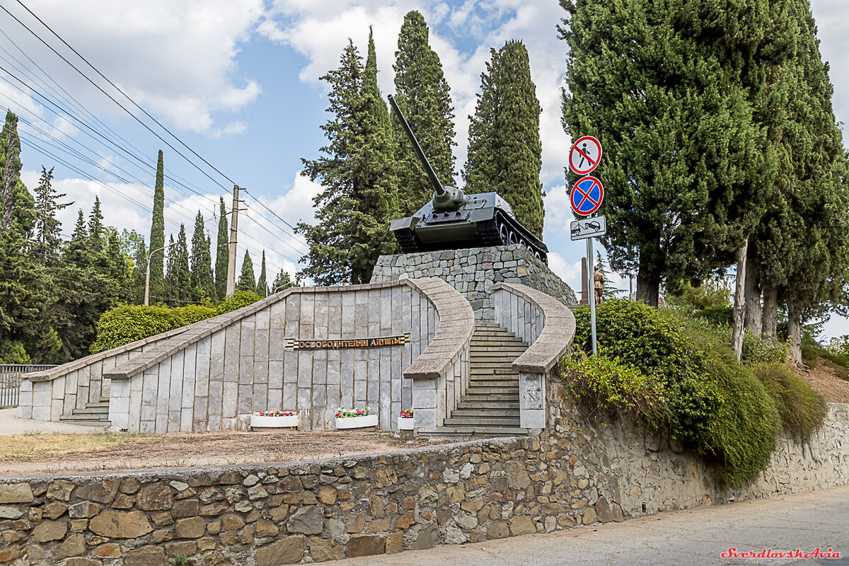В курортном городе Алушта, на перекрестке Симферопольского шоссе и улицы Партизанской, расположен Сквер Победы . На вершине холма, на постаменте, установлена самоходная установка СУ-100. Ее прекрасно видно с трассы, но дорога в этом месте извилистая, движение очень оживленное и проскочить не заметив достаточно просто, плюс ко всему памятник утопает в зелени сквера. Я много раз проезжал мимо него, но все как-то не получалось вовремя перестроиться чтобы свернуть и остановиться. Этим летом поехал целенаправленно, проложил маршрут на навигаторе, чтобы не проскочить свороток. Состояние памятника хорошо, видно что к юбилею победы его вымыли и заново покрасили. Памятник был сооружен и установлен в сквере в 1985 году, к 40-летию Победы в Великой Отечественной войне. Он посвящен событиям освобождения Алушты от немецко-фашистских захватчиков. Самоходная установка СУ-100 была разработана в КБ Уралмаша, на базе танка Т-34-85 в конце 1943 года. Серийное производство началось в августе 1944 года и б