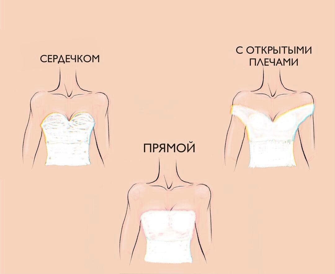 1. «Сердечко». Эффектное платье без рукавов и лямок, верхняя часть лифа которого имеет форму сердца с углублением в центре. Такой вырез всегда выгодно подчеркивает большую грудь.