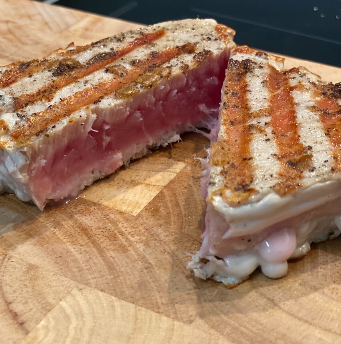 Степень прожарки лучше выбирать среднюю, чтобы тунец остался сочным и мягким. Главное не пересушить.
