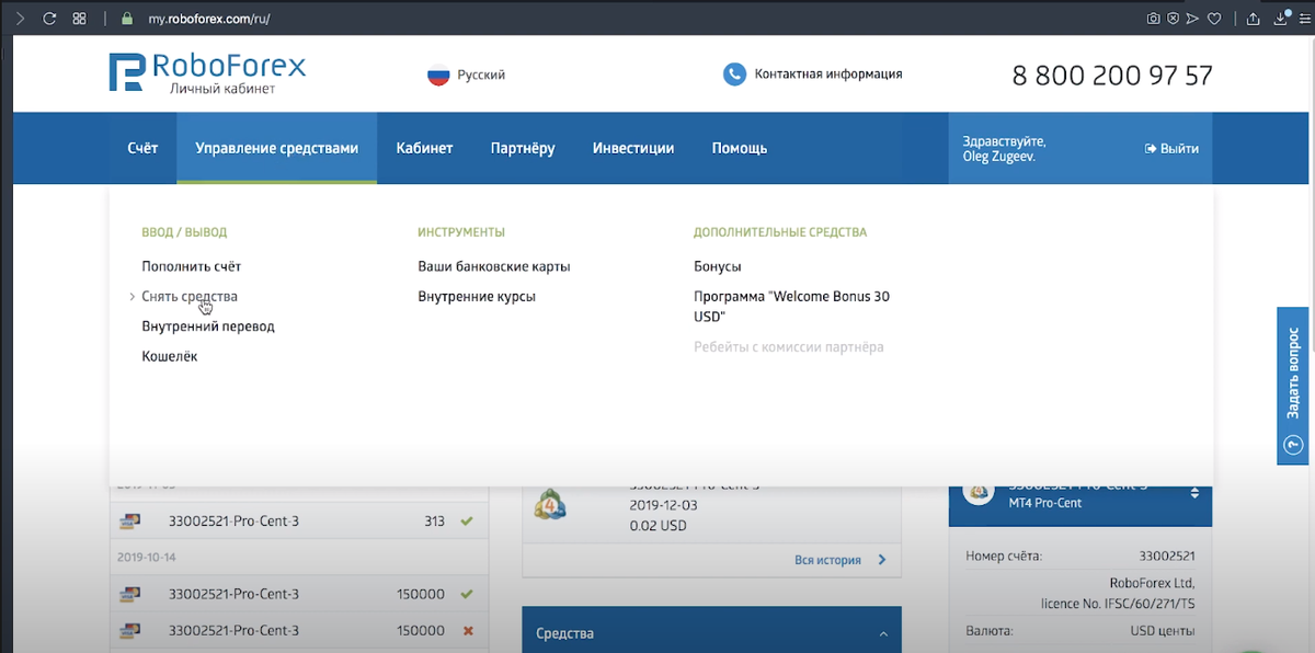 1. Заходим в личный кабинет, выбираем торговый счет и нажимаем "Управление средствами". Далее нажимаем "Снять средства".