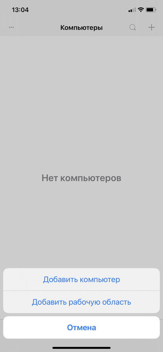 1. Запустите приложение после установки и нажмите на добавление нового подключения нажав "+" в правом верхнем углу. Выберете "Добавить компьютер"