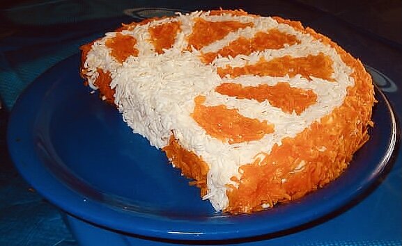 Сварите морковь, натрите её на мелкой тёрке. Выложите морковь последним слоем.