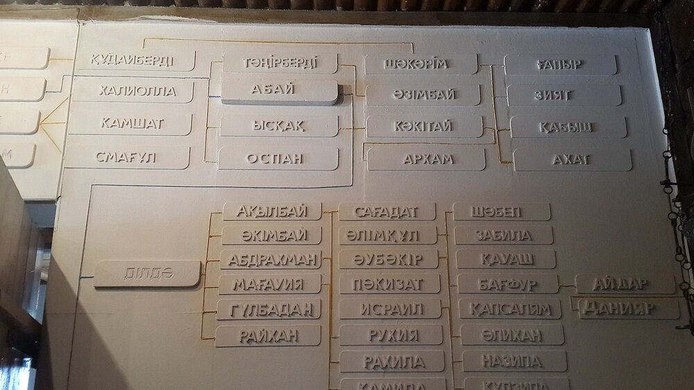 В музейном комплексе Абая в урочище Жидебай, в 182 км от Семея (бывший Семипалатинск) – фамильной усадьбе потомков Кунанбая, хранится генеалогическое древо Абая Кунанбаева.