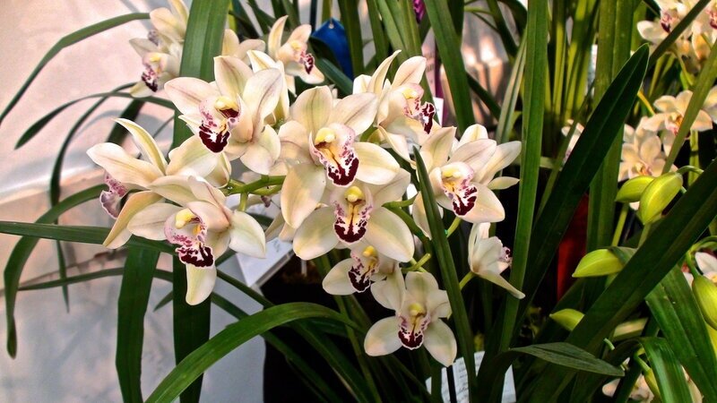 Орхидея Цимбидиум (Cymbidium) является одной из самых больших представительниц своего вида. Листья цимбидиума в домашних условиях способны достигать метровой длины. Отдельные экземпляры, встречающиеся в природе способны достигать двух метров в высоту. В магазинах мы чаще всего можем встретить миниатюрные цимбидиумы, высота которых не превышает полуметра. Цветы цимбидиума способны достигать 13 сантиметров в диаметре. Цветоносы прорезаются у основания псевдобульб. Многие из этих орхидей имеют ярко выраженный аромат. Процесс цветения длится от 3 недель до полугода, в зависимости от сорта гибрида и окружающей среды.