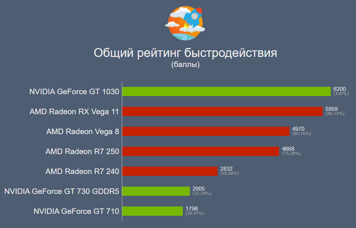 Обычно принято, что разбор бюджетных видеокарт начинается с модели GeForce GT 1030. Она из числа актуальных, однако на сегодняшний день в интернет-магазинах недорогие видеокарты для бюджетных компьютеров начинаются с устаревших моделей GeForce GT 710 и 730, а также Radeon R7 240 и 250, и у меня, кстати, про них часто спрашивают. Друзья, однозначно эти видеокарты покупать не нужно. К примеру, лидер по производительности карт прежних поколений - Radeon R7 250 2013 года выпуска - стоит 4000-5000 руб., но она слабее GeForce GT 1030 на 60% (!). У GeForce GT 1030 же цена 6000. руб., и, соответственно, выбор здесь очевиден. Что касается GeForce GT 730 выпуска 2014 года, то она слабее GT 1030 чуть ли не в 3 раза, и платить за неё даже 3 тыс. руб. не стоит. Да что уж говорить про GeForce GT 1030, когда даже встроенная в современные бюджетные процессоры 2019 года AMD Ryzen 3 3200G графика Vega 8 мощнее Radeon R7 250 на 15-20%. Вот, взгляните на сравнительный рейтинг быстродействия упомянутых видеокарт на фоне GeForce GT 1030.