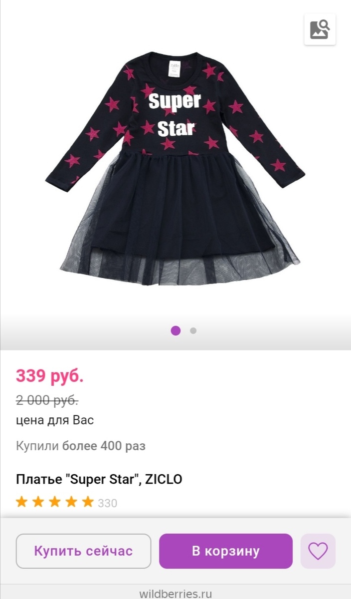 1. Это платье имеет 4 расцветки и очень много отзывов. При этом все они хорошие. И цена приемлимая - 339 руб. Одного из них даже не оказалось на складе. С ним ваша принцесса точно будет " Super Star"
