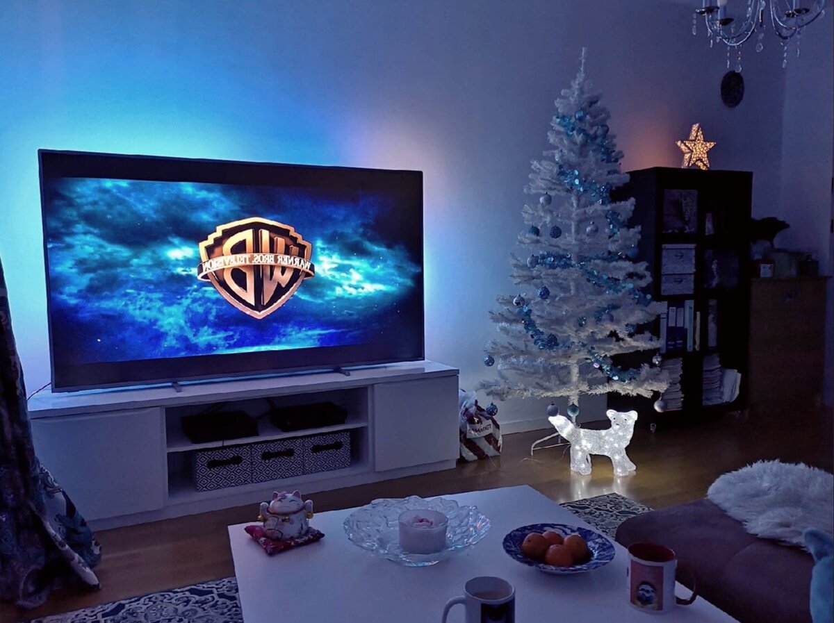 Ну и конечно же,при выборе новогодней елки,пал глаз на эту белоснежную красавицу. Но на этой фотографии взгляд точно не на неё,не на большой телевизор,а на маленького лисёнка под елкой,который так и светится,как прожектор. Первое время,когда мы поставили эту фигурку,собака пугалась и немного злилась на него,а потом наступила другая стадия, интерес и почему мой «новый друг» не хочет поиграть. -Давай же! Смотри какие я тебе игрушки принёс!
