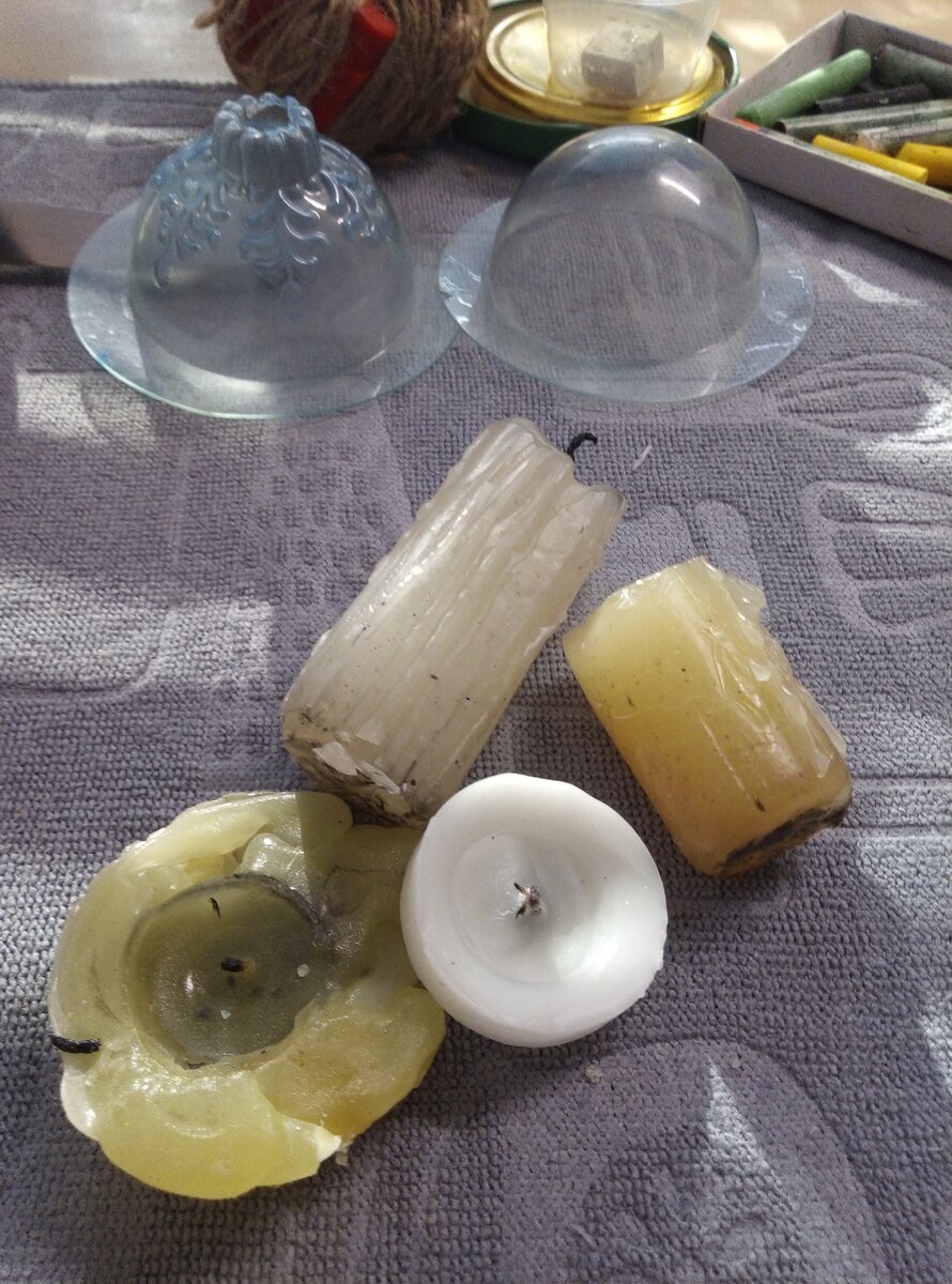 Собираю все свечные огарки.Есть остатки и от обычных свечей,и от плавающих.Сначала,из обычной свечки достаю фитиль,а из плавающей-фитиледержатель.