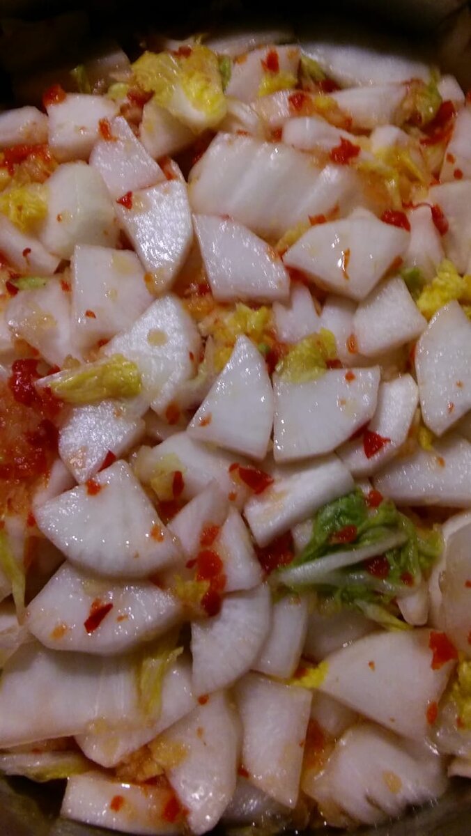 Это рецепт чимчи, которое делалось у нас еще у бабушки, бабушка очень любила редьку и часто засаливала е вместе с капустой. Я купила 1,5 кг. капусты, так вытянул один велок пекинской капусты и чуть больше 1 кг дайкона, так как зеленой редьки увы не было. Почистив половину от общего количества редьки, получилось 3 штуки, все овощи хорошо помыла и порезала на удобные для еды кусочки.